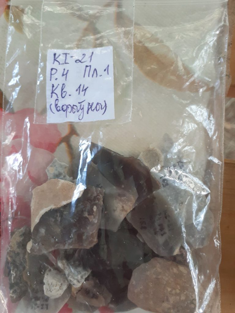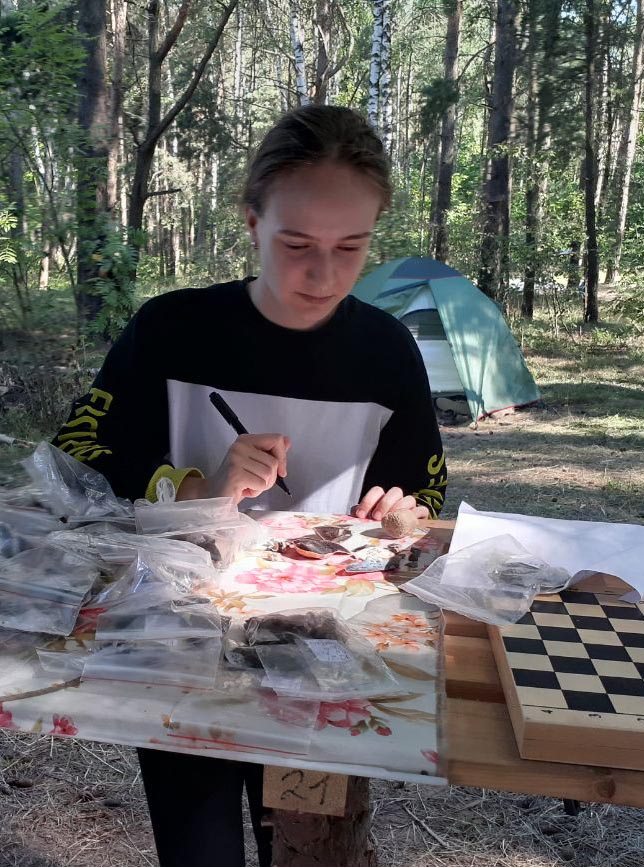 Знойдзеныя падчас раскопак лускавіны, нуклеусы студэнткі мыюць, сушаць, раскладваюць па асобных пакетах, якія падпісваюцца і нумаруюцца.