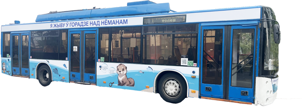 На троллейбусе, который движется по маршруту №1 «Гродно Азот – Фолюш», появилась реклама, призывающая охранять природу и окружающую среду. Анимационные изображения выдры сопровождают мотивационные тексты, например, «наш чысты мір – здаровае жыццё», «чыстыя берагі – гэта залог умоў майго пражывання», «эканомце ваду – яна важная для мяне і ўсіх жывёл» и другие.